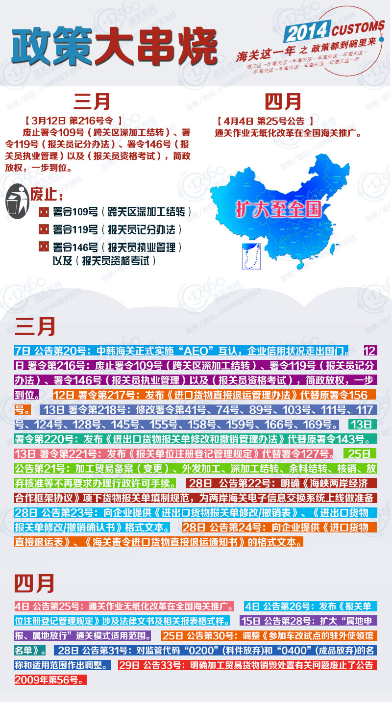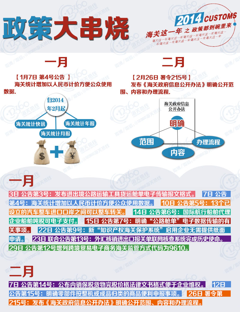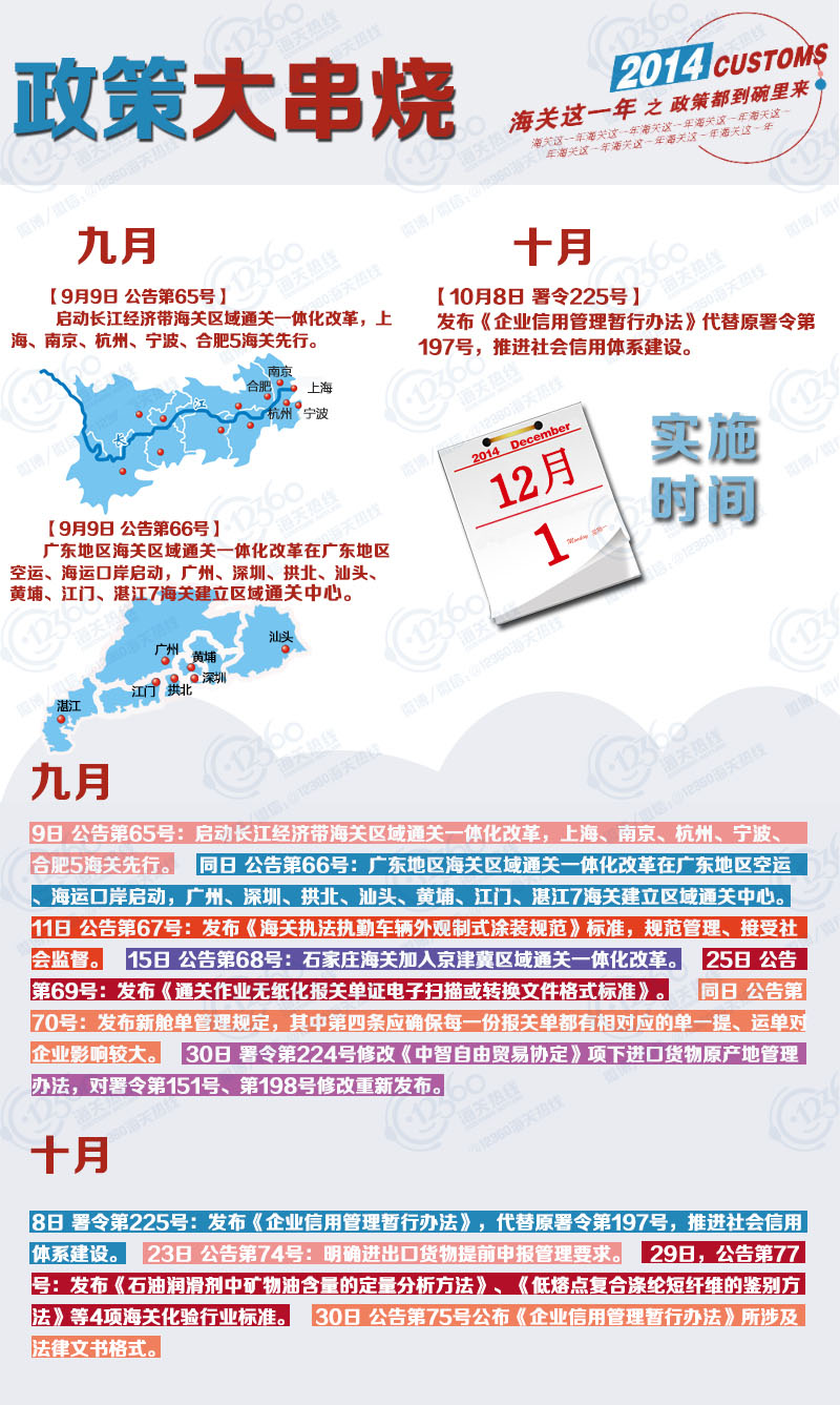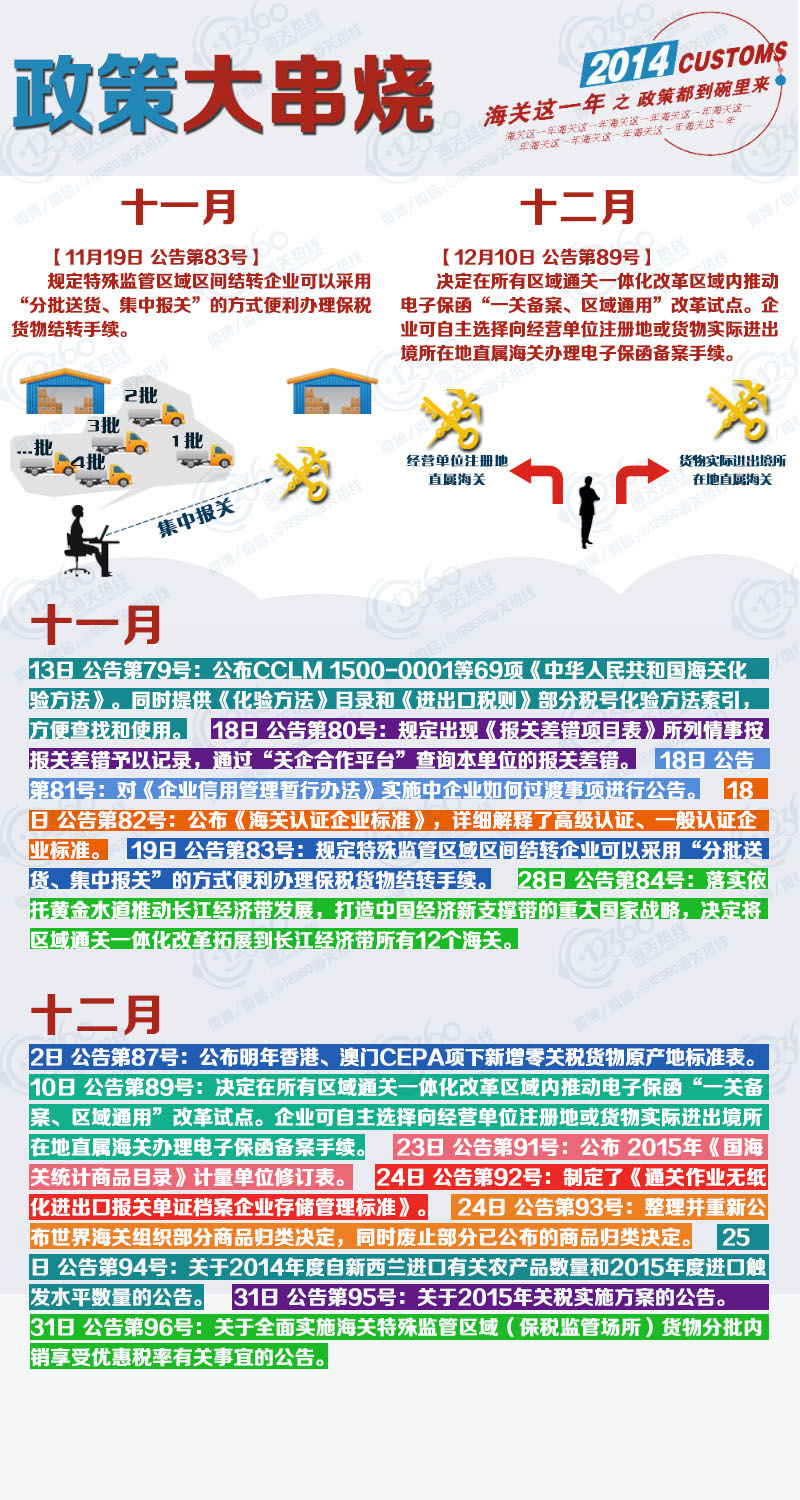 2014,改革的一年,海关也是蛮拼的,发布了96个公告,11个署令。 既要管得住,又要通得快,抓改革、减审批、严监管、重服务,为了外贸,为了减轻企业负担,做了不少工作。新年伊始,让我们一起回顾下刚刚过去的“海关这一年”吧!