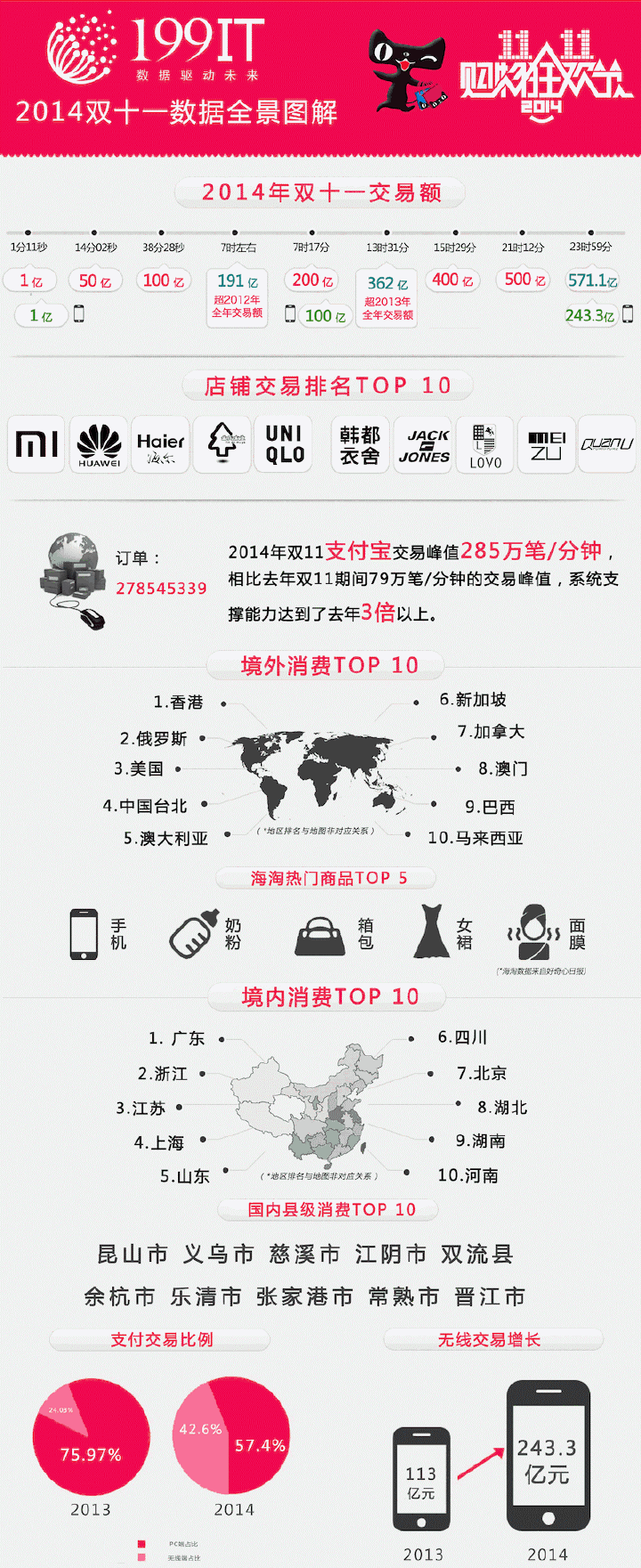 2014年移动端交易额243亿,占42.6%(2014年第三个季度这个数据是35.8%,去年双十一是15.3%),所以阿里现在号称成全球第一大移动电商!