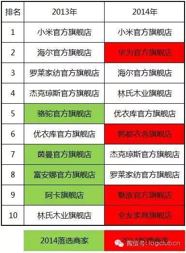 小米继续领跑,华为上升得太猛了。2013年10大商家有5个服饰,3个家纺|家具,1个手机,1个家电。2014年服饰没落,变成3个手机商,3个服饰,3个家纺|家具,1个家电。