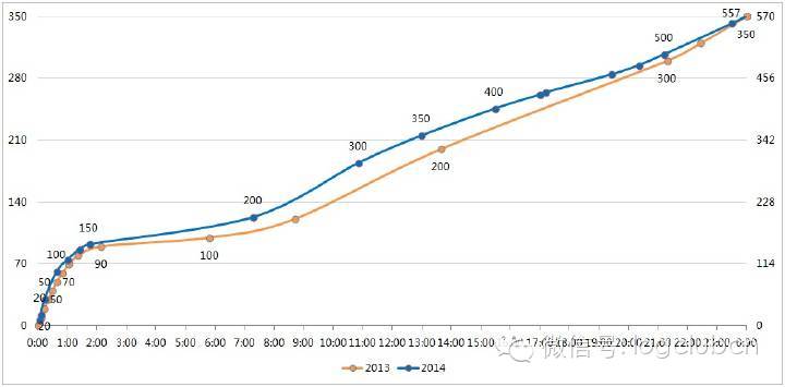 这是各关键交易节点的走势图,从中可以看到今年在12:58就超越了去年的350亿。如果能拿到阿里的实时走势数据就是极好的了,可以目前只能根据网络曝光的数据整理成图。