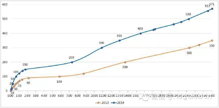 换一种方式来看这张图,将上面这张图改成双坐标轴展示,可以看出16:00左右,及400亿之前今年的节奏都超过2013年的节奏,后来的8个小时的增长速度其实是落后于2013年的,如果同步增长的话,今年完成600亿应该是没有问题的。