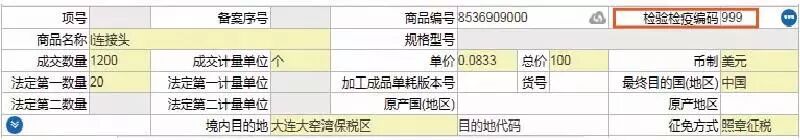 例如:申报进口商品“活龙虾”,需先在“商品编号”栏录入 “0306329000” 10位数编号,再在“检验检疫编码”栏下拉菜单的“101活虾”、“102鲜活或冷的带壳或去壳的龙虾(养殖)”和“103鲜活或冷的带壳或去壳的龙虾(野生的)” 中,选择“101活虾”检验检疫附加编号。