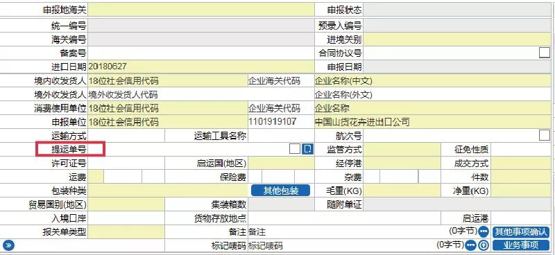 该申报项目为有条件必填项,在货物实际进出境触发必填项。 该项目数据类型为字符型,最多支持录入32位。 二、录入要求 填报载运货物进出境的航次号。填报内容应与运输部门向海关申报的舱单(载货清单)所列相应内容一致。 提醒注意: (一)直接在进出境地或采用全国通关一体化通关模式办理报关手续的报关单。 1. 水路运输:填报船舶的航次号。 2. 公路运输:启用公路舱单前,填报运输车辆的8位进出境日期〔顺序为年(4位)、月(2位)、日(2位),下同〕。启用公路舱单后,填报货物运输批次号。 3. 铁路运输:填报列车的进出境日期。 4. 航空运输:免予填报。 5. 邮件运输:填报运输工具的进出境日期。 6. 其他运输方式:免予填报。 (二)转关运输货物的报关单。 1. 进口。 (1)水路运输:中转转关方式填报“@”+进境干线船舶航次。直转、提前报关免予填报。 (2)公路运输:免予填报。 (3)铁路运输:“@”+8位进境日期。 (4)航空运输:免予填报。 (5)其他运输方式:免予填报。 2. 出口。 (1)水路运输:非中转货物免予填报。中转货物:境内水路运输填报驳船航次号;境内铁路、公路运输填报6位启运日期〔顺序为年(2位)、月(2位)、日(2位)〕。 (2)铁路拼车拼箱捆绑出口:免予填报。 (3)航空运输:免予填报。 (4)其他运输方式:免予填报。 (三)无实际进出境的货物,免予填报。 三、编码规则 无。 四、其他说明 (一)项目沿革 该项目为原报关“航次号”与原报检项目的“运输工具号码”,现合并为“航次号”。 (二)其它 无。 该申报项目为有条件必填项,在货物实际进出境触发必填项。 该项目数据类型为32位字符型。 二、录入要求 填报进出口货物提单或运单的编号。一份报关单只允许填报一个提单或运单号,一票货物对应多个提单或运单时,应分单填报。 提醒注意: (一)直接在进出境地或采用全国通关一体化通关模式办理报关手续的。 1.水路运输:填报进出口提单号。如有分提单的,填报进出口提单号+“*”+分提单号。 2.公路运输:启用公路舱单前,免予填报;启用公路舱单后,填报进出口总运单号。 3.铁路运输:填报运单号。 4.航空运输:填报总运单号+“_”+分运单号,无分运单的填报总运单号。 5.邮件运输:填报邮运包裹单号。 (二)转关运输货物的报关单。 1.进口。 (1)水路运输:直转、中转填报提单号。提前报关免予填报。 (2)铁路运输:直转、中转填报铁路运单号。提前报关免予填报。 (3)航空运输:直转、中转货物填报总运单号+“_”+分运单号。提前报关免予填报。 (4)其他运输方式:免予填报。 (5)以上运输方式进境货物,在广东省内用公路运输转关的,填报车牌号。 2.出口。 (1)水路运输:中转货物填报提单号;非中转货物免予填报;广东省内汽车运输提前报关的转关货物,填报承运车辆的车牌号。 (2)其他运输方式:免予填报。广东省内汽车运输提前报关的转关货物,填报承运车辆的车牌号。 (三)采用“集中申报”通关方式办理报关手续的,报关单填报归并的集中申报清单的进出口起止日期〔按年(4位)月(2位)日(2位)年(4位)月(2位)日(2位)〕。 (四)无实际进出境的货物,免予填报。 三、编码规则 无。 四、其他说明 (一)项目沿革 该项目为原报关项目的“提运单号”和原报检项目的“提货单号”,现合并为“提运单号”,录入要求无变化。 (二)其它 无。